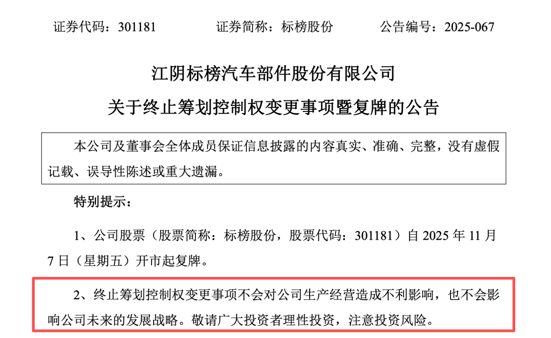 10月30日宣布筹划控制权变更,11月6日宣布终止。仅一周时间,标榜股份(301181)的控制权变更事项已终止。