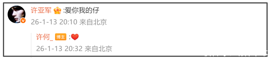随后,许亚军火速在评论区留言“爱你我的仔”,许何也回了爱心表达爱意。从许何和许亚军的互动来看,双方似乎是有达成共识,不然不会回复那么及时,且用语跟缅怀何晴没有一点关系。许亚军的表达完全是秀父子情。