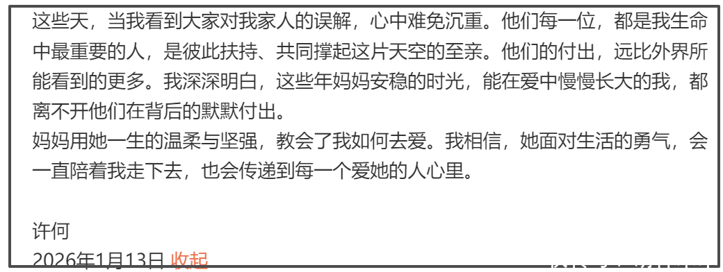 许何表示看到许亚军等家人遭到误解,为此感到难过,毕竟他们都是自己生命中最重要的人,还特别强调妈妈这些年安稳的时光也都离不开许亚军和后妈的默默付出。